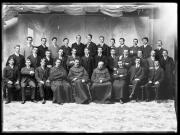 Ripresa in studio. Ritratto di gruppo di 33 uomini, in mezzo quattro ecclesiastici seduti