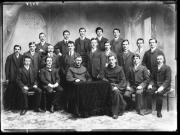 Ripresa in studio. Ritratto di gruppo di 20 uomini, in mezzo due ecclesiastici seduti