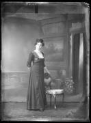 Ripresa in studio. Ritratto di una donna in piedi vicino a una sedia