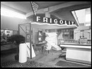 Ripresa interno. Esposizione di vetrina refrigerante. Al di sopra è situata la scritta "Frigolit" e un cartello triangolare con la scritte "Frigidaire General Motors Mercantile Meran Schweitzer Bozen"