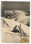 Uno sciatore seduto sulla neve guarda le cime delle montagne circostanti