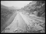 Ripresa in esterno. Lavoratori, cantiere, muro in pietra, binari