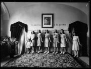 Ripresa interna. Ritratto di gruppo di sette donne una bambina. Sul muro l'iscrizione "la donna è la prima responsabile del destino di un popolo", una frase dal regolamento dell "piccole italiane", il gruppo della "opera nazional ballila" per bambine tra le 8 e le 14. Sul muro un ritratto di Benito Mussolini