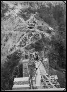 Ripresa in esterno. Cantiere. Costruzione di un ponte in montagna